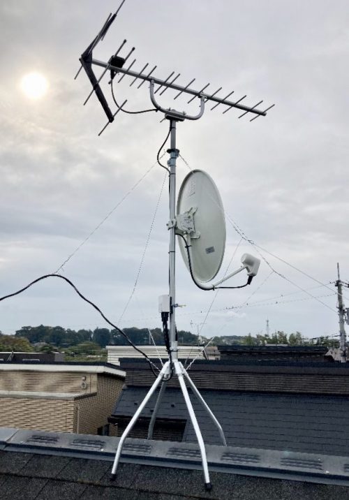 工事に取りかかります。屋根上に屋根馬を取り付け、アンテナマストを立てて四隅に支線をしっかり張ります。アンテナマストにはめ込む形で、ローチャンネル八木アンテナ設置を行いました。さらに八木アンテナの下部にBSアンテナ取付を行い、UBブースターで地デジとBSを混合させました。