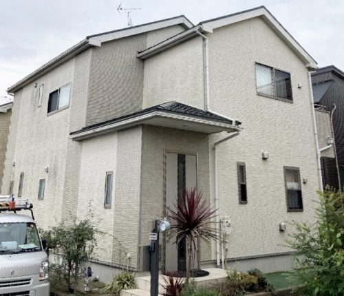 アイボリーと淡いグレイ、薄茶色がステキなハーモニーを奏でているお家です。玄関まわりの植栽も華やかで、高級感が漂っています。