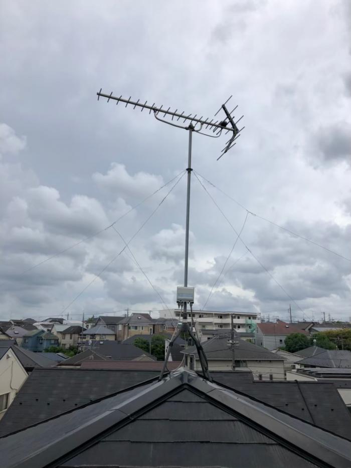 その昔、八木秀次博士が発明した形状(魚の骨のような形状)からマイナーチェンジを繰り返し洗練されたフォルムとなり、中・弱電界エリアにも対応可能な安心のDXアンテナ社製。UHF20素子アンテナの性能で、吹きさらしで障害物の少ない屋根上に設置することが多いため利得が高くなっております。万が一、壁面や屋内でデザインアンテナを取り付けられない物件 にも最適。従来の鉄製の太いワイヤーとは異なり、ステンレス製の丈夫で錆びにくいワイヤー(支線)を採用。アンテナマストから屋根の四隅に向けて4本の支線を張り巡らせ、さらに張り巡らせた支線の途中からも屋根馬に向けて4本の支線をバランスよく張り、合計8本の支線で頑丈に設置しております。サイズは51.8cm×34cm×101.4cmとなっており、VHF(アナログアンテナ)と比較して、大幅なサイズダウンと軽量化がなされています。しかも耐風速(破壊風速)50m/s。地デジ放送が始まる前の時代より、屋根上に設置するアンテナは災害に強くなっていると言えるでしょう。当店で人気ナンバー2の地デジアンテナでございます。