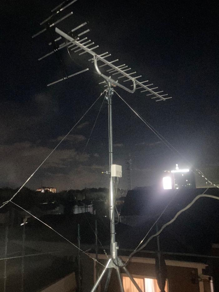 その昔、八木秀次博士が発明した形状(魚の骨のような形状)からマイナーチェンジを繰り返し洗練されたフォルムとなり、中・弱電界エリアにも対応可能な安心のDXアンテナ社製。UHF20素子アンテナの性能で、吹きさらしで障害物の少ない屋根上に設置することが多いため利得が高くなっております。万が一、壁面や屋内でデザインアンテナを取り付けられない物件 にも最適。従来の鉄製の太いワイヤーとは異なり、ステンレス製の丈夫で錆びにくいワイヤー(支線)を採用。アンテナマストから屋根の四隅に向けて4本の支線を張り巡らせ、さらに張り巡らせた支線の途中からも屋根馬に向けて4本の支線をバランスよく張り、合計8本の支線で頑丈に設置しております。サイズは51.8cm×34cm×101.4cmとなっており、VHF(アナログアンテナ)と比較して、大幅なサイズダウンと軽量化がなされています。しかも耐風速(破壊風速)50m/s。地デジ放送が始まる前の時代より、屋根上に設置するアンテナは災害に強くなっていると言えるでしょう。当店で人気ナンバー2の地デジアンテナでございます。