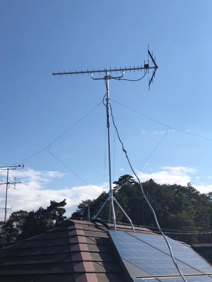 その昔、八木秀次博士が発明した形状(魚の骨のような形状)からマイナーチェンジを繰り返し洗練されたフォルムとなり、中・弱電界エリアにも対応可能な安心のDXアンテナ社製。UHF20素子アンテナの性能で、吹きさらしで障害物の少ない屋根上に設置することが多いため利得が高くなっております。万が一、壁面や屋内でデザインアンテナを取り付けられない物件 にも最適。従来の鉄製の太いワイヤーとは異なり、ステンレス製の丈夫で錆びにくいワイヤー(支線)を採用。アンテナマストから屋根の四隅に向けて4本の支線を張り巡らせ、さらに張り巡らせた支線の途中からも屋根馬に向けて4本の支線をバランスよく張り、合計8本の支線で頑丈に設置しております。サイズは51.8cm×34cm×101.4cmとなっており、VHF(アナログアンテナ)と比較して、大幅なサイズダウンと軽量化がなされています。しかも耐風速(破壊風速)50m/s。地デジ放送が始まる前の時代より、屋根上に設置するアンテナは災害に強くなっていると言えるでしょう。当店で人気ナンバー2の地デジアンテナでございます。