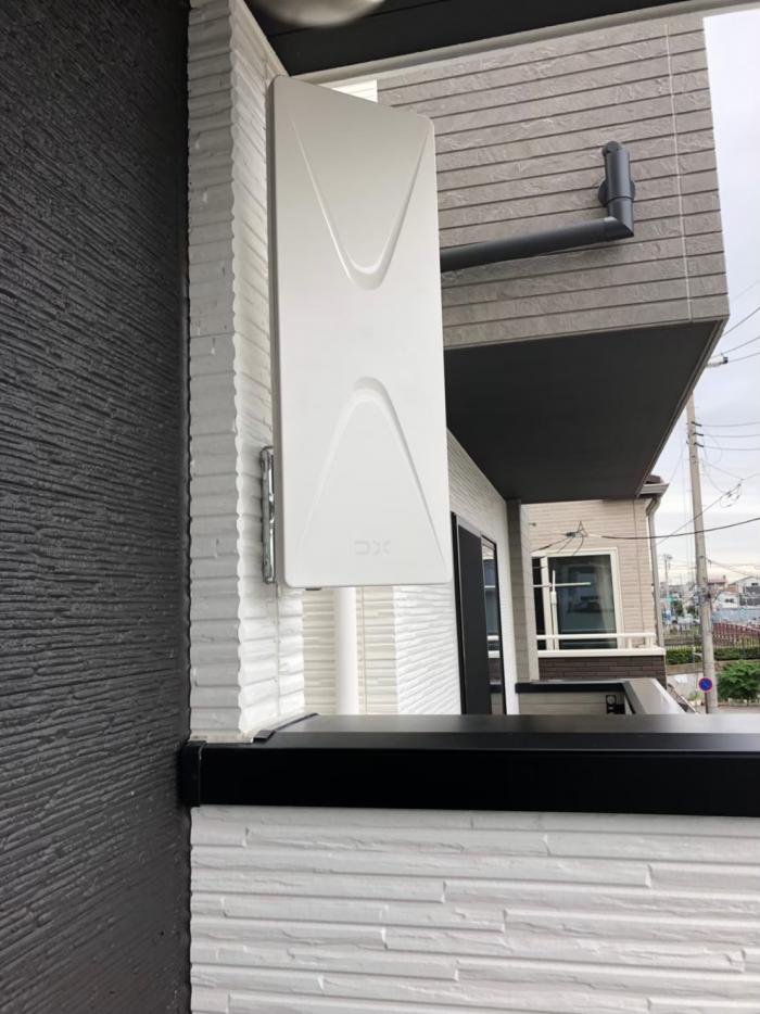 カラーバリエーションはオフホワイトライトブラウンスーパーブラックブラックブラウンの4色から現場で選択することが可能です。同じUHF20素子相当のデザインアンテナを比較した場合、業界トップクラスの受信性能、高利得を誇る大手DXアンテナ社製。本体の厚みはわずか119mm、サイズは高さ590mm×幅220mmで業界最小クラス。コンパクトサイズのため狭い屋根裏や天井裏などへの取り付けも最適。壁面に取り付けの場合は、極細のビスを6箇所打ち込んで金具を取り付け、金具にガチャンと本体をはめ込みボルトを締めるだけの簡単施工が可能なため建物へのダメージを極力軽減できます。ブースターが必要な場合はUAH201の背面にスッキリ取り付けられる構造になっており、表にブースターが露出しないので外観もキレイに保てます(弊社では電波状況が悪くない限り、なるべくブースターも屋内の、分配器の近くに隠してしております)。修理の場合、ブースター内蔵タイプのデザインアンテナとは異なり、ブースターだけの交換をできるメリットがあります。太陽光発電システムや片流れ屋根で屋根上に屋根馬を立てられず昔ながらの八木アンテナを設置できない住宅にも最適。耐風速(破戒風速)50m/sですが、屋内や外壁など、強風の影響を受けにくい取り付け位置と形状をしているため、災害にも強いアンテナとなっております。当店人気ナンバー1の地デジアンテナでございます。