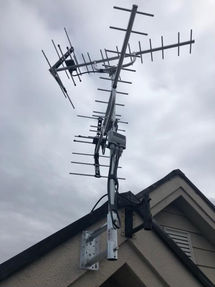 その昔、八木秀次博士が発明した形状(魚の骨のような形状)からマイナーチェンジを繰り返し洗練されたフォルムとなり、中・弱電界エリアにも対応可能な安心のDXアンテナ社製。UHF20素子アンテナの性能で、吹きさらしで障害物の少ない屋根上に設置することが多いため利得が高くなっております。万が一、壁面や屋内でデザインアンテナを取り付けられない物件 にも最適。従来の鉄製の太いワイヤーとは異なり、ステンレス製の丈夫で錆びにくいワイヤー(支線)を採用。アンテナマストから屋根の四隅に向けて4本の支線を張り巡らせ、さらに張り巡らせた支線の途中からも屋根馬に向けて4本の支線をバランスよく張り、合計8本の支線で頑丈に設置しております。サイズは51.8cm×34cm×101.4cmとなっており、VHF(アナログアンテナ)と比較して、大幅なサイズダウンと軽量化がなされています。しかも耐風速(破壊風速)50m/s。地デジ放送が始まる前の時代より、屋根上に設置するアンテナは災害に強くなっていると言えるでしょう。当店で人気ナンバー2の地デジアンテナでございます。