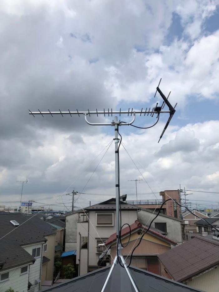 その昔、八木秀次博士が発明した形状(魚の骨のような形状)からマイナーチェンジを繰り返し洗練されたフォルムとなり、中・弱電界エリアにも対応可能な安心のDXアンテナ社製。UHF20素子アンテナの性能で、吹きさらしで障害物の少ない屋根上に設置することが多いため利得が高くなっております。万が一、壁面や屋内でデザインアンテナを取り付けられない物件 にも最適。従来の鉄製の太いワイヤーとは異なり、ステンレス製の丈夫で錆びにくいワイヤー(支線)を採用。アンテナマストから屋根の四隅に向けて4本の支線を張り巡らせ、さらに張り巡らせた支線の途中からも屋根馬に向けて4本の支線をバランスよく張り、合計8本の支線で頑丈に設置しております。サイズは51.8cm×34cm×101.4cmとなっており、VHF(アナログアンテナ)と比較して、大幅なサイズダウンと軽量化がなされています。しかも耐風速(破壊風速)50m/s。地デジ放送が始まる前の時代より、屋根上に設置するアンテナは災害に強くなっていると言えるでしょう。当店で人気ナンバー2の地デジアンテナでございます。