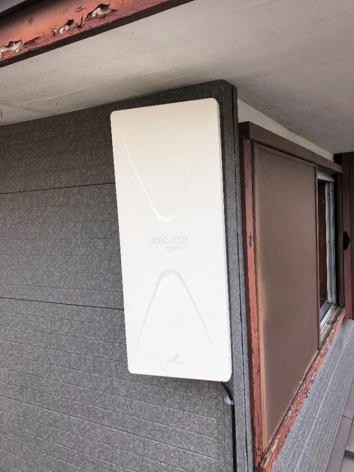 カラーバリエーションはオフホワイトライトブラウンスーパーブラックブラックブラウンの4色から現場で選択することが可能です。同じUHF20素子相当のデザインアンテナを比較した場合、業界トップクラスの受信性能、高利得を誇る大手DXアンテナ社製。本体の厚みはわずか119mm、サイズは高さ590mm×幅220mmで業界最小クラス。コンパクトサイズのため狭い屋根裏や天井裏などへの取り付けも最適。壁面に取り付けの場合は、極細のビスを6箇所打ち込んで金具を取り付け、金具にガチャンと本体をはめ込みボルトを締めるだけの簡単施工が可能なため建物へのダメージを極力軽減できます。ブースターが必要な場合はUAH201の背面にスッキリ取り付けられる構造になっており、表にブースターが露出しないので外観もキレイに保てます(弊社では電波状況が悪くない限り、なるべくブースターも屋内の、分配器の近くに隠してしております)。修理の場合、ブースター内蔵タイプのデザインアンテナとは異なり、ブースターだけの交換をできるメリットがあります。太陽光発電システムや片流れ屋根で屋根上に屋根馬を立てられず昔ながらの八木アンテナを設置できない住宅にも最適。耐風速(破戒風速)50m/sですが、屋内や外壁など、強風の影響を受けにくい取り付け位置と形状をしているため、災害にも強いアンテナとなっております。当店人気ナンバー1の地デジアンテナでございます。