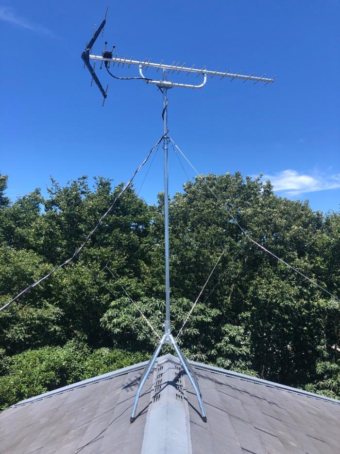 その昔、八木秀次博士が発明した形状(魚の骨のような形状)からマイナーチェンジを繰り返し洗練されたフォルムとなり、中・弱電界エリアにも対応可能な安心のDXアンテナ社製。UHF20素子アンテナの性能で、吹きさらしで障害物の少ない屋根上に設置することが多いため利得が高くなっております。万が一、壁面や屋内でデザインアンテナを取り付けられない物件 にも最適。従来の鉄製の太いワイヤーとは異なり、ステンレス製の丈夫で錆びにくいワイヤー(支線)を採用。アンテナマストから屋根の四隅に向けて4本の支線を張り巡らせ、さらに張り巡らせた支線の途中からも屋根馬に向けて4本の支線をバランスよく張り、合計8本の支線で頑丈に設置しております。サイズは51.8cm×34cm×101.4cmとなっており、VHF(アナログアンテナ)と比較して、大幅なサイズダウンと軽量化がなされています。しかも耐風速(破壊風速)50m/s。地デジ放送が始まる前の時代より、屋根上に設置するアンテナは災害に強くなっていると言えるでしょう。当店で人気ナンバー2の地デジアンテナでございます。