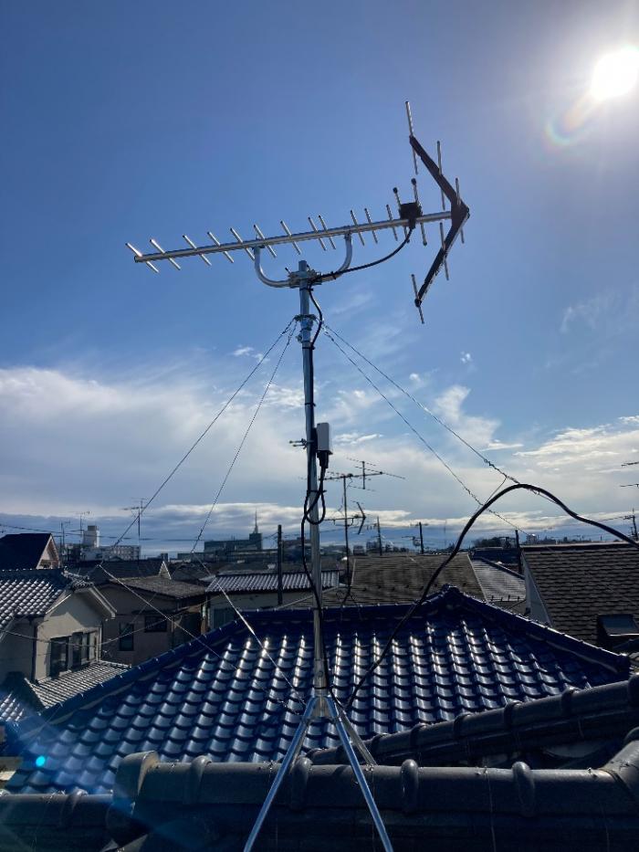 その昔、八木秀次博士が発明した形状(魚の骨のような形状)からマイナーチェンジを繰り返し洗練されたフォルムとなり、中・弱電界エリアにも対応可能な安心のDXアンテナ社製。UHF20素子アンテナの性能で、吹きさらしで障害物の少ない屋根上に設置することが多いため利得が高くなっております。万が一、壁面や屋内でデザインアンテナを取り付けられない物件 にも最適。従来の鉄製の太いワイヤーとは異なり、ステンレス製の丈夫で錆びにくいワイヤー(支線)を採用。アンテナマストから屋根の四隅に向けて4本の支線を張り巡らせ、さらに張り巡らせた支線の途中からも屋根馬に向けて4本の支線をバランスよく張り、合計8本の支線で頑丈に設置しております。サイズは51.8cm×34cm×101.4cmとなっており、VHF(アナログアンテナ)と比較して、大幅なサイズダウンと軽量化がなされています。しかも耐風速(破壊風速)50m/s。地デジ放送が始まる前の時代より、屋根上に設置するアンテナは災害に強くなっていると言えるでしょう。当店で人気ナンバー2の地デジアンテナでございます。