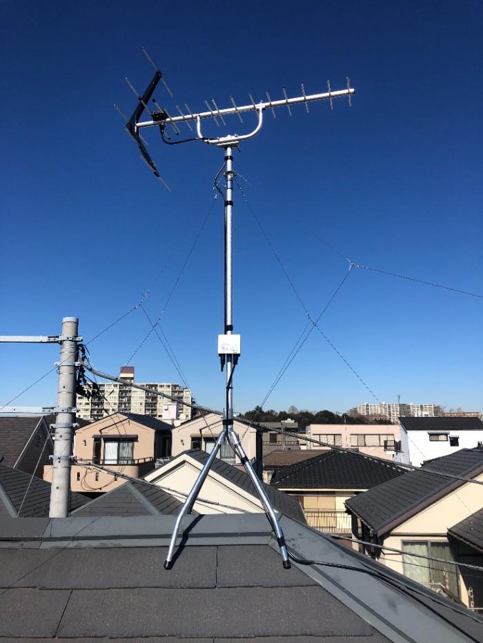 その昔、八木秀次博士が発明した形状(魚の骨のような形状)からマイナーチェンジを繰り返し洗練されたフォルムとなり、中・弱電界エリアにも対応可能な安心のDXアンテナ社製。UHF20素子アンテナの性能で、吹きさらしで障害物の少ない屋根上に設置することが多いため利得が高くなっております。万が一、壁面や屋内でデザインアンテナを取り付けられない物件 にも最適。従来の鉄製の太いワイヤーとは異なり、ステンレス製の丈夫で錆びにくいワイヤー(支線)を採用。アンテナマストから屋根の四隅に向けて4本の支線を張り巡らせ、さらに張り巡らせた支線の途中からも屋根馬に向けて4本の支線をバランスよく張り、合計8本の支線で頑丈に設置しております。サイズは51.8cm×34cm×101.4cmとなっており、VHF(アナログアンテナ)と比較して、大幅なサイズダウンと軽量化がなされています。しかも耐風速(破壊風速)50m/s。地デジ放送が始まる前の時代より、屋根上に設置するアンテナは災害に強くなっていると言えるでしょう。当店で人気ナンバー2の地デジアンテナでございます。