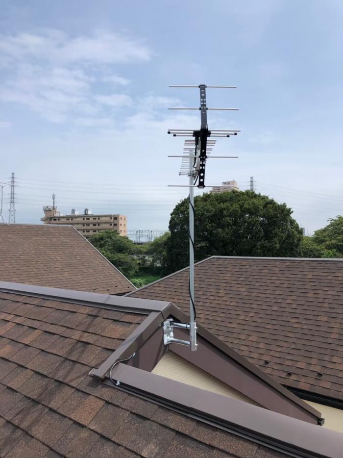 その昔、八木秀次博士が発明した形状(魚の骨のような形状)からマイナーチェンジを繰り返し洗練されたフォルムとなり、中・弱電界エリアにも対応可能な安心のDXアンテナ社製。UHF20素子アンテナの性能で、吹きさらしで障害物の少ない屋根上に設置することが多いため利得が高くなっております。万が一、壁面や屋内でデザインアンテナを取り付けられない物件 にも最適。従来の鉄製の太いワイヤーとは異なり、ステンレス製の丈夫で錆びにくいワイヤー(支線)を採用。アンテナマストから屋根の四隅に向けて4本の支線を張り巡らせ、さらに張り巡らせた支線の途中からも屋根馬に向けて4本の支線をバランスよく張り、合計8本の支線で頑丈に設置しております。サイズは51.8cm×34cm×101.4cmとなっており、VHF(アナログアンテナ)と比較して、大幅なサイズダウンと軽量化がなされています。しかも耐風速(破壊風速)50m/s。地デジ放送が始まる前の時代より、屋根上に設置するアンテナは災害に強くなっていると言えるでしょう。当店で人気ナンバー2の地デジアンテナでございます。